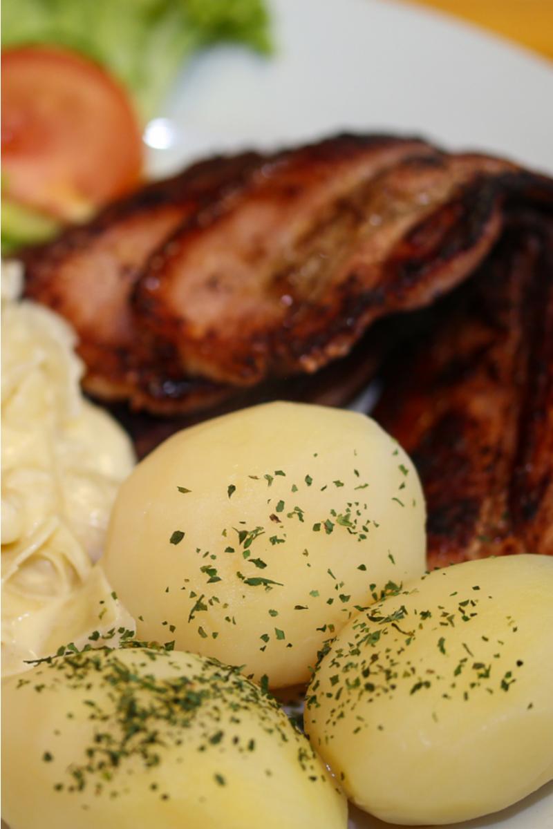 Du velger selv om du vil ha kokt potet eller pommes frites til.